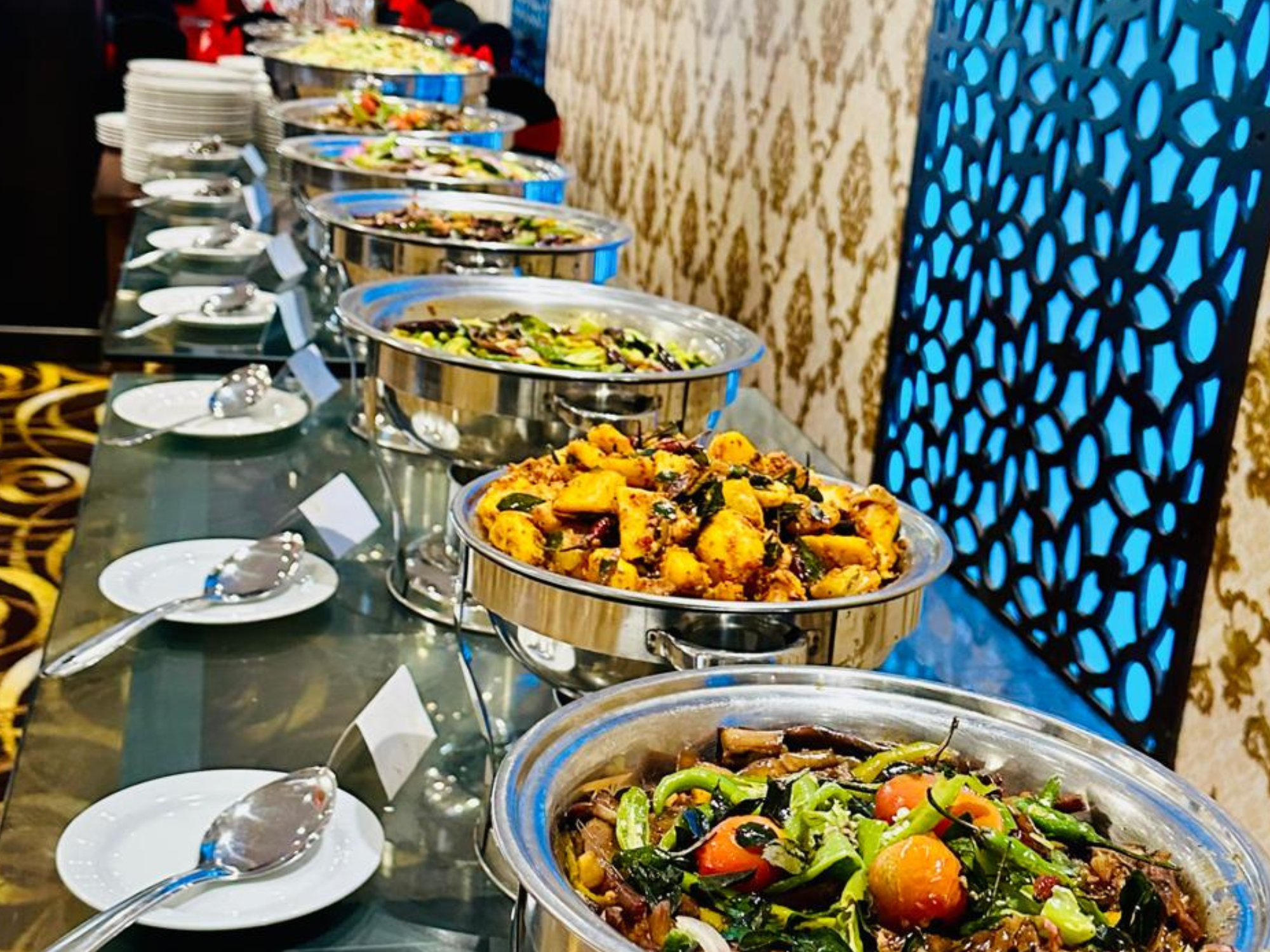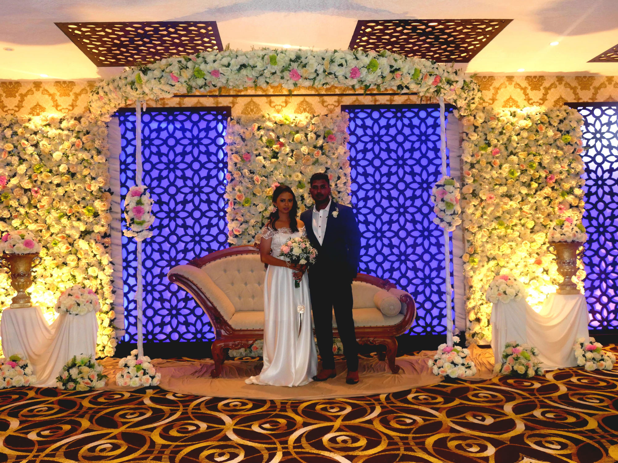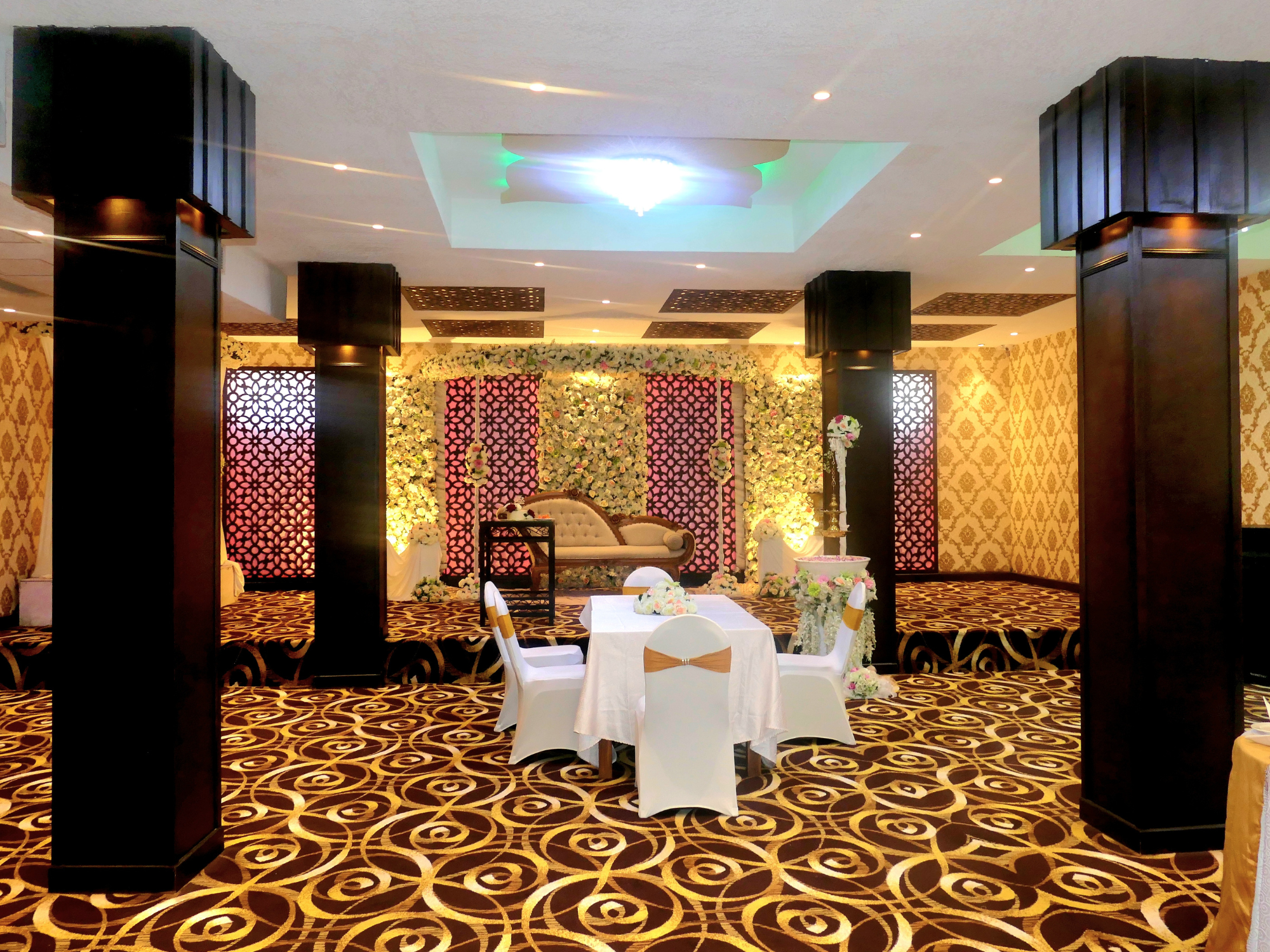 A vibrant reception hall setup with glowing décor, patterned walls, and floral arrangements that add sophistication.
